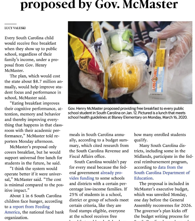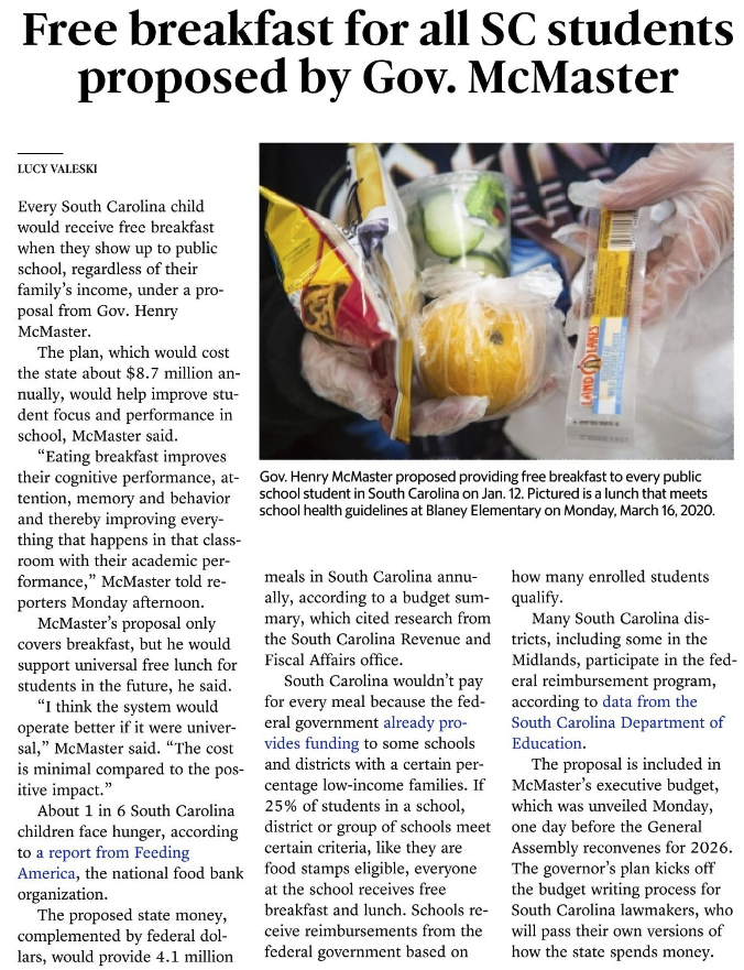 “Eating breakfast improves their cognitive performance, attention, memory and behavior and thereby improving everything that happens in that classroom with their academic performance,” McMaster told reporters Monday afternoon.