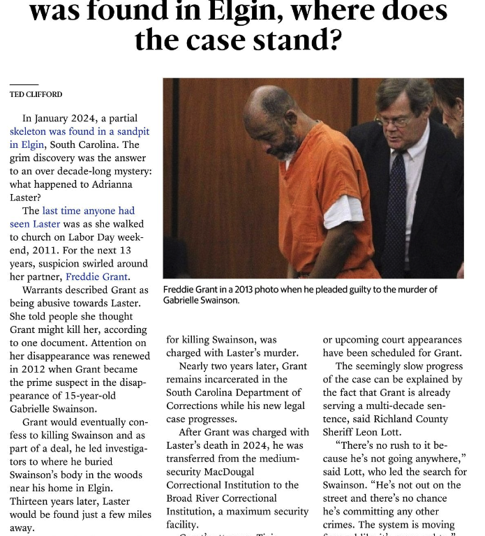 Days after the discovery of Laster’s remains, Grant, who was serving a 30-year sentence for killing Swainson, was charged with Laster’s murder.