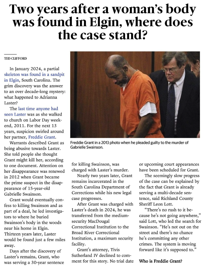 Laster was reported missing in 2012, just months before Grant abducted Swainson. The teenager’s abduction in the middle of the night and the multi-agency manhunt drew national media attention to Columbia. Investigators soon honed in on Grant following Swainson’s disappearance. Grant had a key to Swainson’s home that he had lied about returning and investigators found blood on a scrap of duct tape in his home.