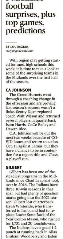 It’s Week 6 in the South Carolina high school football season for 2021. Midlands football scores, schedule Thursday Newberry 34, Columbia 0 Friday AC Flora 34, Westwood 14 Airport 30, Midland Valley 28 Ben Lippen 39, Cardinal Newman 13 Brookland-Cayce 28, Fox Creek 0 Camden 35, Crestwood 26 Chesterfield 57, North Central 50 Dreher 28, Lugoff-Elgin 20 Dutch Fork 60, White Knoll 7 Florence Christian 36, … Continue reading Friday night football scores from Midlands area and SC high school games