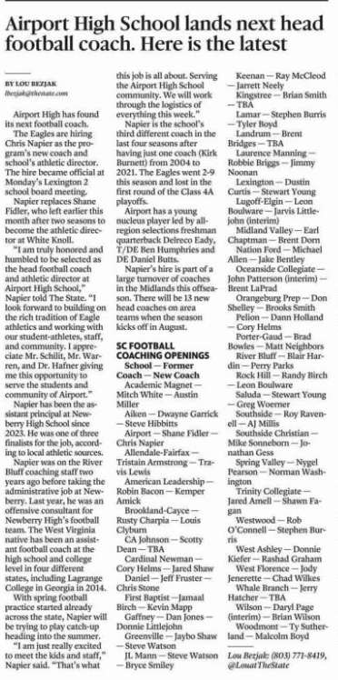Airport High has found its next football coach. The Eagles are hiring Chris Napier as the program’s new coach and school’s athletic director. The hire became official at Monday’s Lexington 2 school board meeting. Napier replaces Shane Fidler, who left earlier this month after two seasons to become the athletic director at White Knoll. “I am truly honored and humbled to be selected as the … Continue reading Airport High School lands next head football coach. Here is the latest